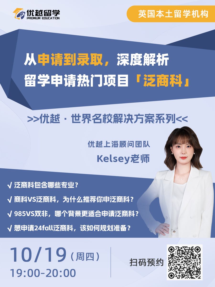 10月19日晚19:00【優(yōu)越留學】直播間,聽優(yōu)越上海顧問團隊Kelsey老師分析王愛曼華“深藏blue”的商學院平替專業(yè)——泛商科,同學們趕緊拿好小板凳蹲直播!