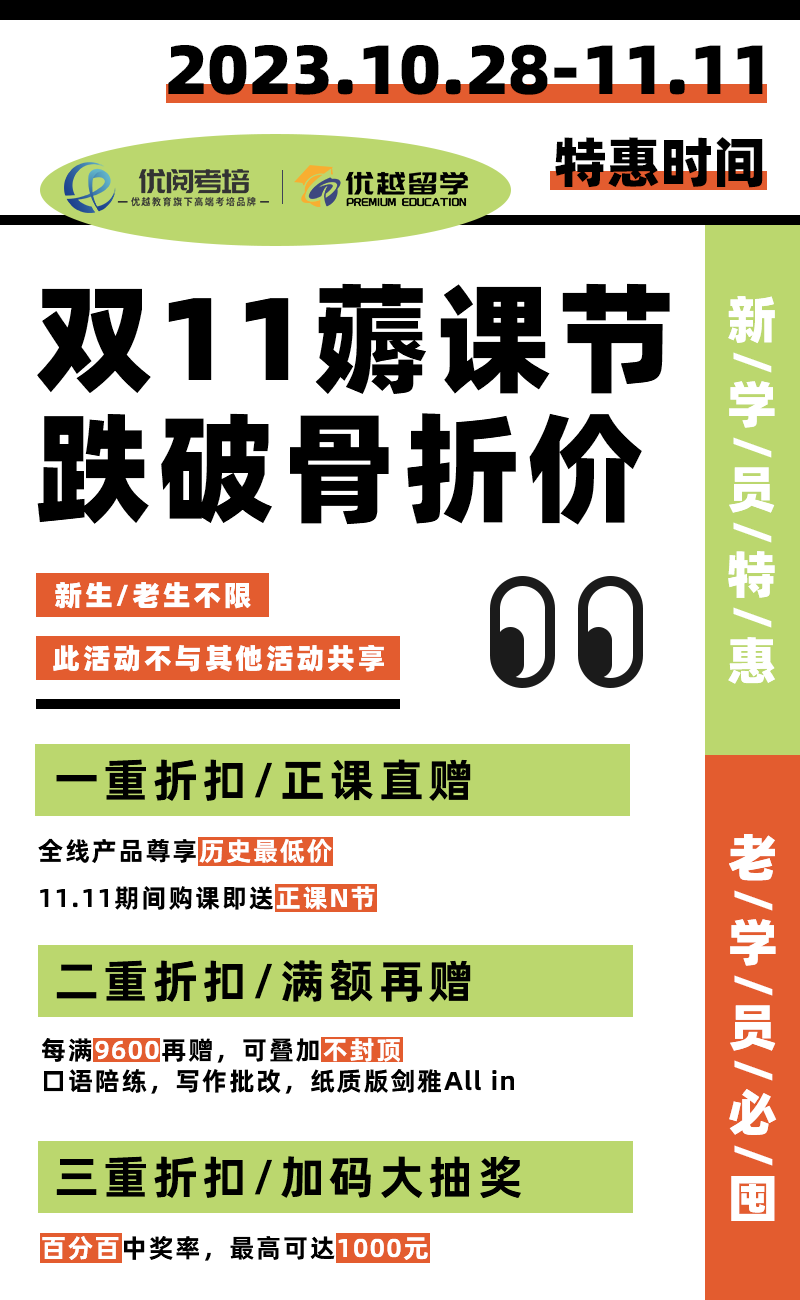 以上是【優(yōu)閱考培雙十一活動開啟!過往365天最低價,折后低至7.5折!】相關(guān)的全部內(nèi)容,查看更多【考培專欄】相關(guān)資訊可前往【優(yōu)越留學】首頁!詳細申請規(guī)劃及方案定制請預約優(yōu)越留學顧問為你一對一解答!