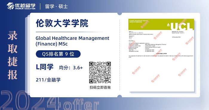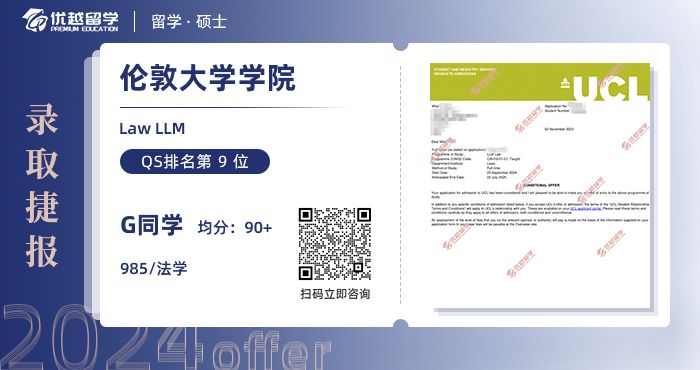 作為一名金融學生,L同學很清楚金融專業(yè)申請的難度。雖然他在成績方面并沒有特別明顯的優(yōu)勢,但在我們的優(yōu)越顧問的幫助下,為他量身定制了適合的專業(yè)方案。此外,我們外籍文書導師更是親自操刀,將L同學的閃光點展現(xiàn)得淋漓盡致。最終,他也如愿以償拿到了UCL的錄取offer。