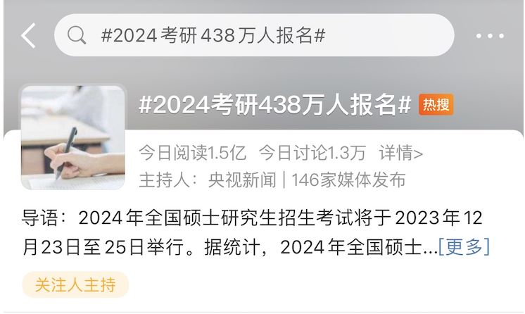 前不久教育部公布了2024考研時(shí)間和報(bào)名人數(shù),結(jié)果顯示約有438萬人報(bào)名了考研,數(shù)字雖然龐大,但卻比去年少了36萬,而且是9年來首次下跌。這對(duì)我們緊張備考的考研er來說屬實(shí)是一個(gè)好消息,競(jìng)爭(zhēng)對(duì)手減少了,“上岸”的機(jī)會(huì)也就更大了。