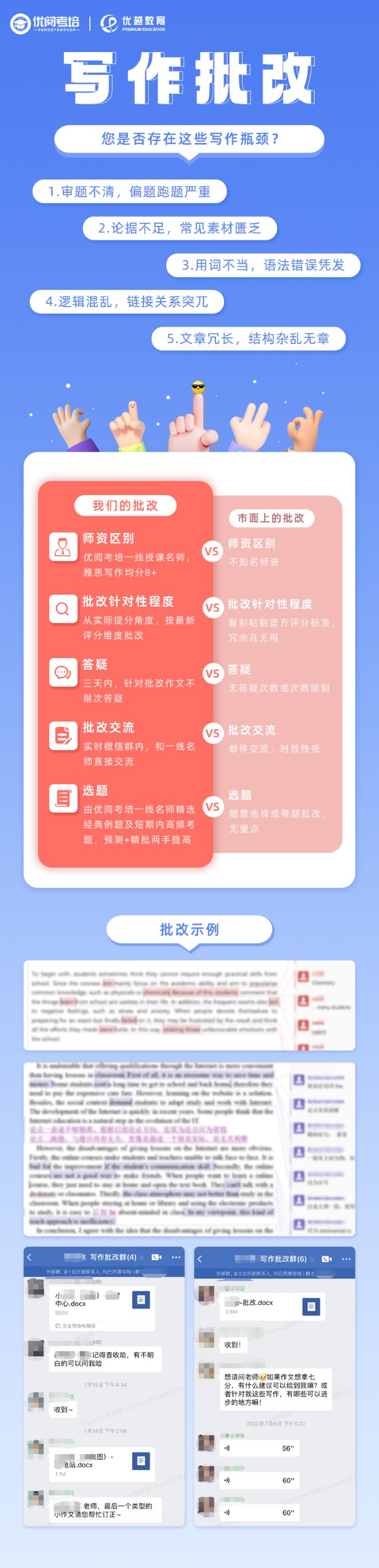 以上是【【課程福利】口語陪練、寫作批改熱銷第一,考前提分效果明顯!】相關(guān)的全部內(nèi)容,查看更多【出國留學雅思】相關(guān)資訊可前往【優(yōu)越留學】首頁!詳細申請規(guī)劃及方案定制請預約優(yōu)越留學顧問為你一對一解答!