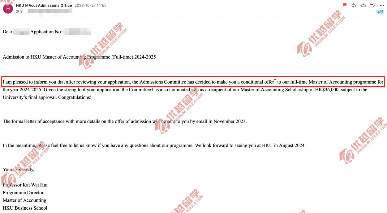 不得不說港大效率還是很高的,3天后就發(fā)來了預(yù)錄取郵件。更讓人驚喜的是,港大還爽快地給了36000港幣獎學(xué)金,這對我們的申請是極大的肯定!