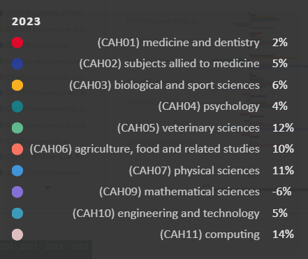 ??舉個例子,2023年農(nóng)業(yè)和獸醫(yī)科學(xué)veterinary science的申請人數(shù)比2022年增加了12%,但實際上申請人數(shù)只有1840。