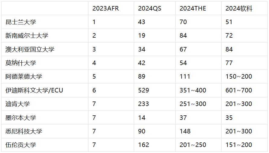 昆士蘭學姐專訪 l 移民or回國就業(yè)?澳洲留學保姆級攻略,附23~24fall申校均分比例圖。接著是大家的“老面孔”,新南威爾士以職業(yè)前景拔尖,澳國立被列到第三,它的科研表現(xiàn)分數(shù)非常亮眼。