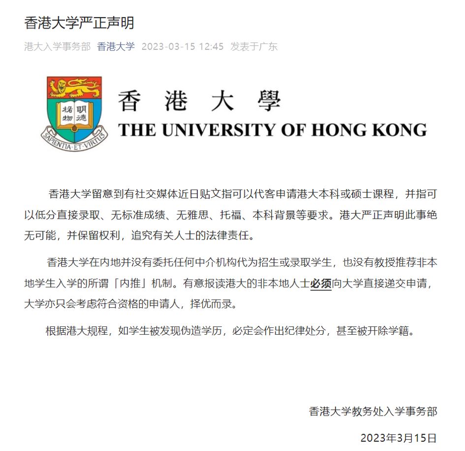 早在2023年3月,香港大學(xué)就已經(jīng)發(fā)布嚴(yán)肅聲明:學(xué)校沒有任何保錄取業(yè)務(wù),提醒學(xué)生不要相信任何“保錄取”說法!