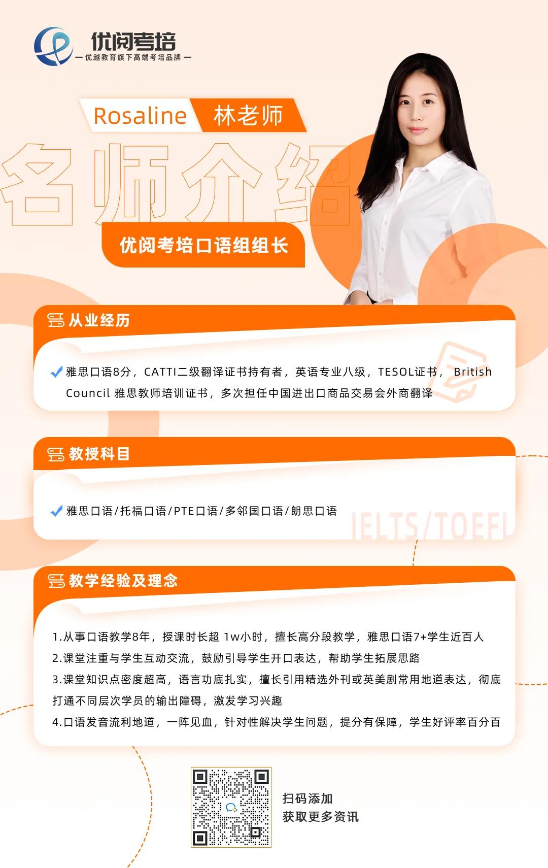 當時負責B學長口語提分的,是優(yōu)越考培的Rosaline老師,林老師擁有8年的教學經(jīng)驗,口語發(fā)音流利地道,可以針對不同學生的情況進行引導交流。同時,優(yōu)越還搭配了口語陪練服務,實時答疑,在臨考預測方面也有超高的命中率。