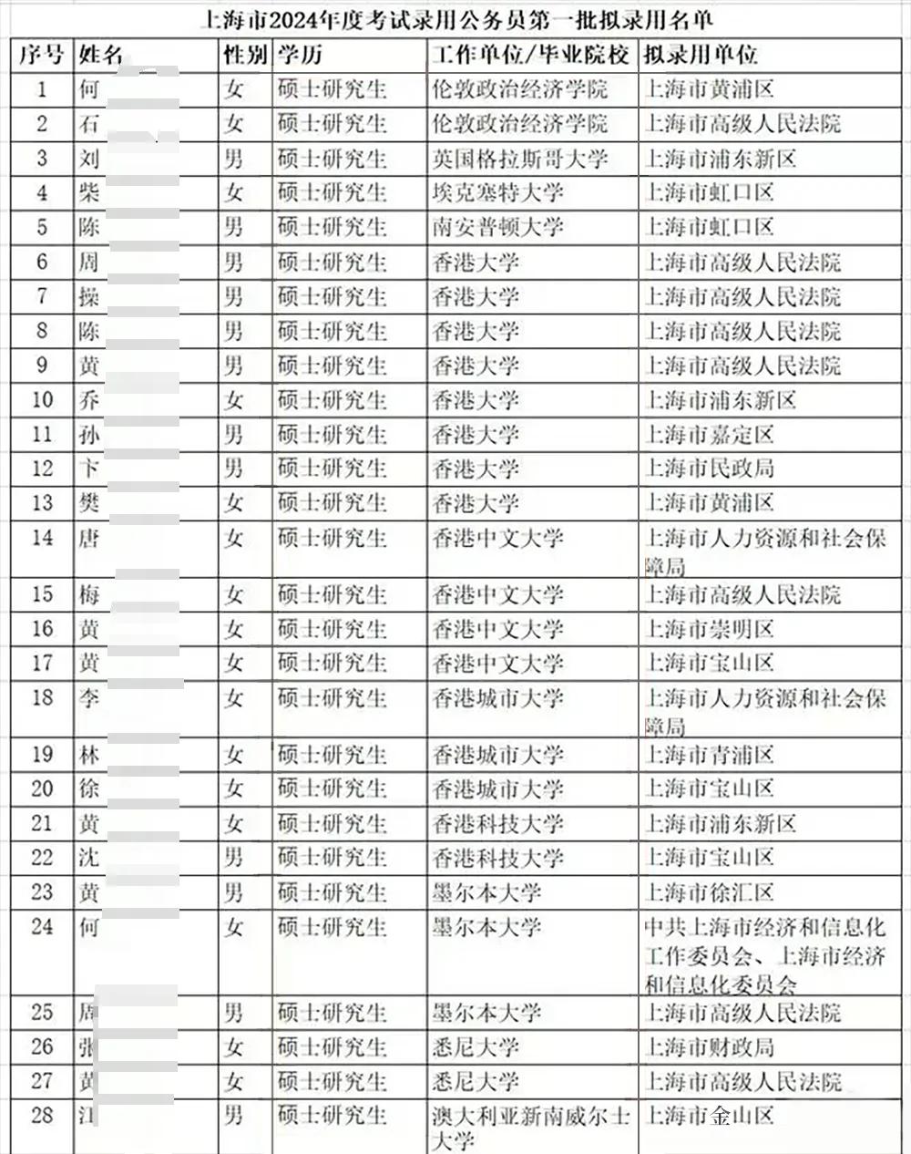 最近,上海市公務(wù)員2024錄用名單在分批公示了,不少網(wǎng)友眼紅,“今年上岸的,基本上都不是普通家庭的孩子。”會(huì)出現(xiàn)這種說(shuō)法主要是由于,今年放榜的錄用名單,清一色碩士不說(shuō),至少30+崗位是海歸碩士直錄!