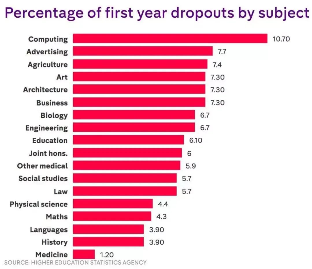 此前,HESA還統(tǒng)計(jì)過(guò)英國(guó)院校各專業(yè)的輟學(xué)率,專業(yè)間的通過(guò)率差距還是挺明顯的。
