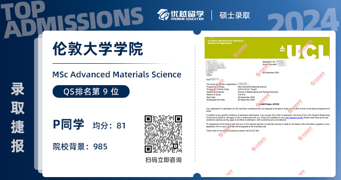 P學(xué)長是去年8月來到優(yōu)越的,經(jīng)過4個(gè)月的努力,憑借2段出色的科研項(xiàng)目表現(xiàn),成功打破專業(yè)均分限制,英國碩士研究生上岸UCL先進(jìn)材料科學(xué)碩士項(xiàng)目。接下來,就跟優(yōu)越君一起看看,是什么樣的學(xué)生,能夠打動(dòng)UCL,降分錄取吧~