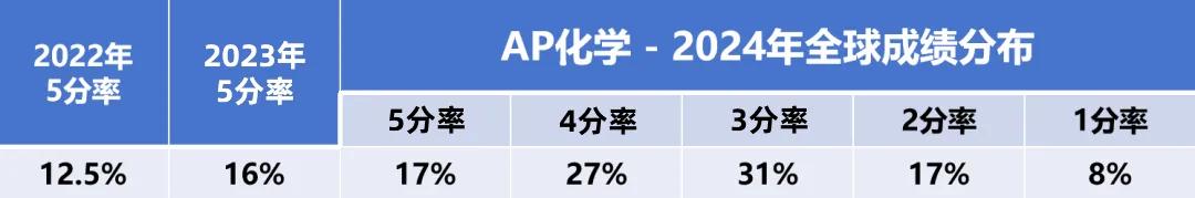 2024年,全球共有約129,000名學(xué)生參加了AP化學(xué)考試。根據(jù)官方給出的數(shù)據(jù),AP化學(xué)5分率突破新高,達到17%,這也是AP化學(xué)連續(xù)第3年5分率提升了。