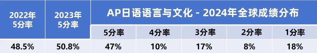 該項目選擇的學(xué)生數(shù)量很少,2024年全球共有2500名學(xué)生參與了日語考試,有3個學(xué)生獲得了滿分。根據(jù)官方最新數(shù)據(jù),AP日語語言與文化近幾年5分率一直在持續(xù)下降,后來學(xué)生選課需慎重考慮一下。