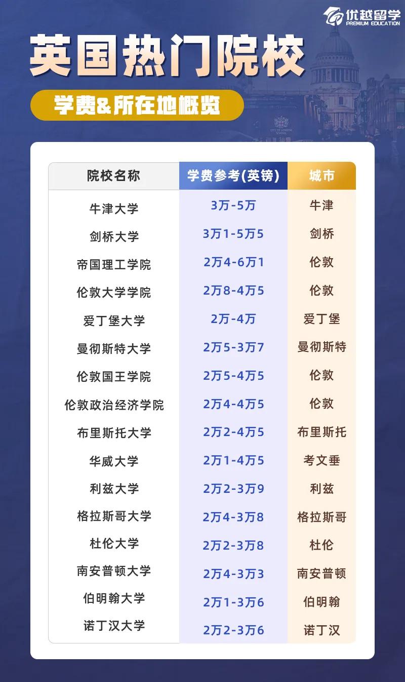 優(yōu)越君將23-24年度英國地區(qū)熱門院校的學(xué)費(fèi)區(qū)間做了一下羅列,25Fall的同學(xué)可以做一個參考。