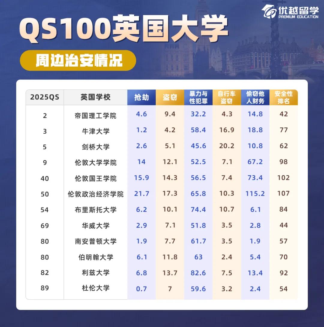 留學(xué)在外,人身安全至關(guān)重要!!今天,優(yōu)越君將結(jié)合英國完全大學(xué)指南以及UKCrimeStats.com發(fā)布的最新數(shù)據(jù),帶大家一起看看英國QS100大學(xué)周邊犯罪率排名情況,24Fall的同學(xué)早知道早預(yù)防,25Fall的同學(xué)可以在選校時(shí)提前考慮好安全問題。