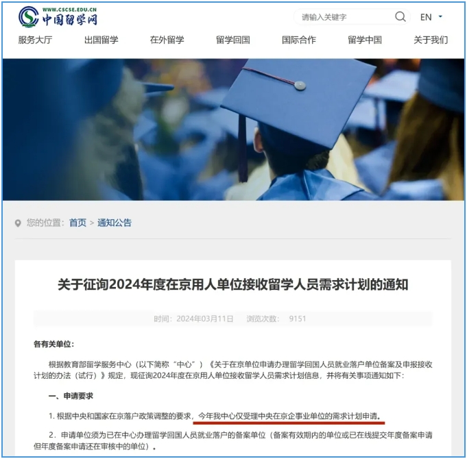 早在今年3月,教育部留學(xué)服務(wù)中心就頒發(fā)重要公告:從2024年起,留服中心將僅受理中央在京企事業(yè)單位落戶申請(qǐng)要求,央企之外,例如名企、外企的海外留學(xué)畢業(yè)生,需要走其他渠道落戶北京。