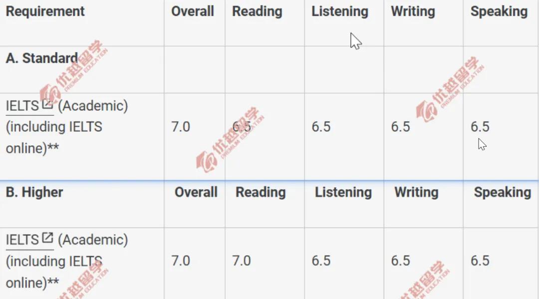 大部分專業(yè)雅思要求為總分6.5,單項(xiàng)不低于6.0。
