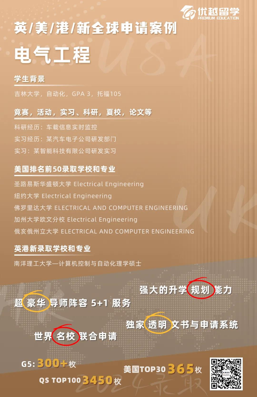 之后,我給他介紹了不同國(guó)家的申請(qǐng)條件以及未來發(fā)展的差異。我比較推薦他申請(qǐng)美國(guó),一方面,電氣工程是美國(guó)的強(qiáng)項(xiàng),無論是就業(yè)還是全球排名,這個(gè)專業(yè)在美國(guó)的發(fā)展和培養(yǎng)方案都更全面。其次,學(xué)生GPA非常低,想要申請(qǐng)英國(guó)和香港的名校,績(jī)點(diǎn)確實(shí)不太夠得上。
