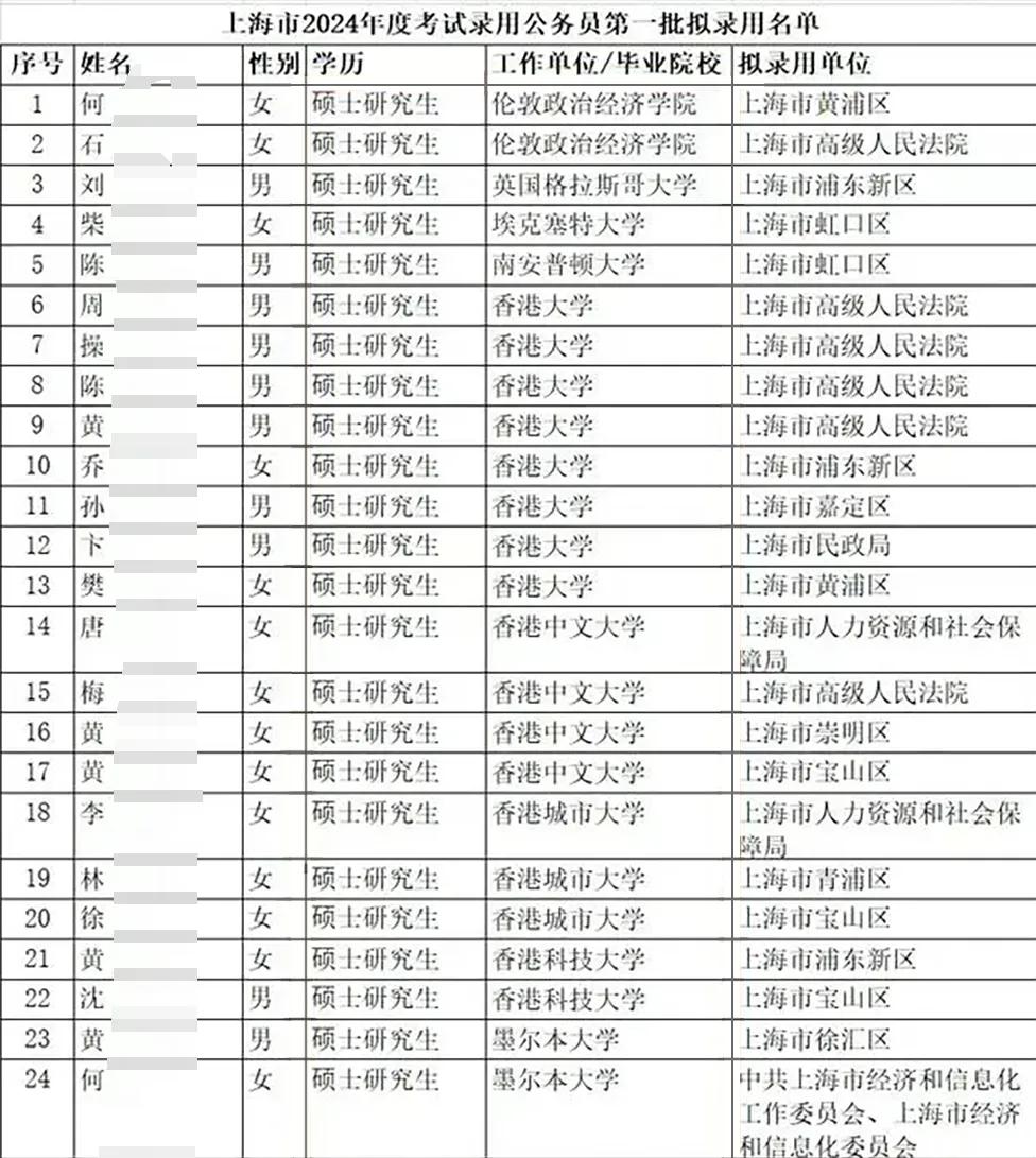 上海市公務(wù)員2024錄用名單,目前已經(jīng)公示的批次中,英港澳碩士起碼占據(jù)了3%的崗位。