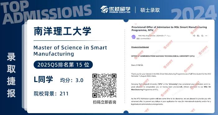 以上是【本期offer榜單:【碩士案例】均分80申請(qǐng)新加坡,上岸南洋理工大學(xué)NTU智能制造碩士! 】相關(guān)的全部?jī)?nèi)容,查看更多【offer榜單】、【名校案例】相關(guān)資訊可前往【優(yōu)越留學(xué)】首頁(yè)!世界名校申請(qǐng),找優(yōu)越留學(xué)!選校定校、申請(qǐng)規(guī)劃、文書寫作、背景提升、方案定制一套搞定!點(diǎn)擊【在線咨詢】,優(yōu)越留學(xué)顧問24h在線為您一對(duì)一解答!