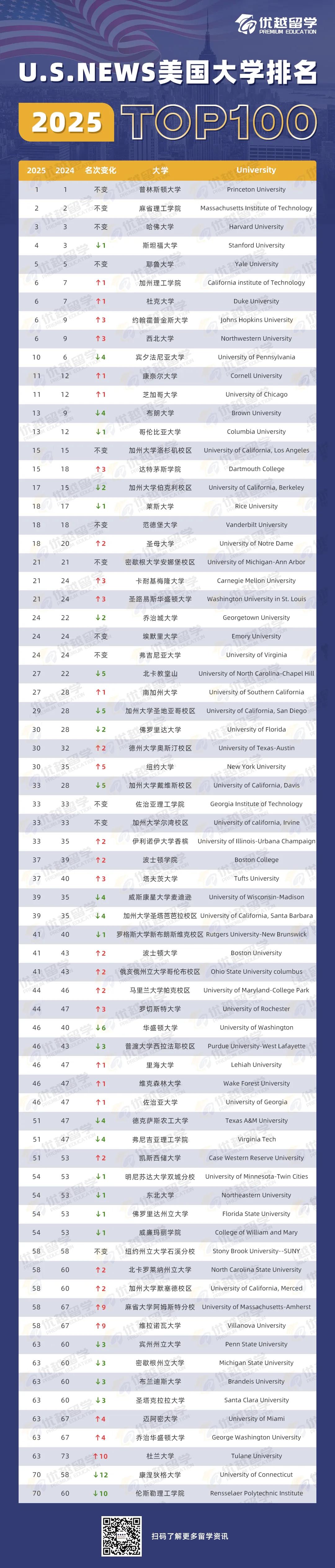 好啦!2025 U.S.News美國大學(xué)排名最新情況就到這里啦!優(yōu)越君也必須告訴大家!部分大學(xué)的名次下降,不代表其學(xué)術(shù)實(shí)力、教學(xué)水準(zhǔn)下降,更不代表其申請難度下降!