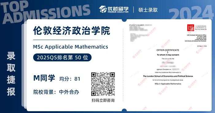 以上是【本期offer榜單:【碩士案例】中外合辦4+0,均分80逆襲上岸倫敦政經(jīng)LSE應(yīng)用數(shù)學(xué)專業(yè) 】相關(guān)的全部?jī)?nèi)容,查看更多【offer榜單】、【名校案例】相關(guān)資訊可前往【優(yōu)越留學(xué)】首頁(yè)!世界名校申請(qǐng),找優(yōu)越留學(xué)!選校定校、申請(qǐng)規(guī)劃、文書寫作、背景提升、方案定制一套搞定!點(diǎn)擊【在線咨詢】,優(yōu)越留學(xué)顧問(wèn)24h在線為您一對(duì)一解答!