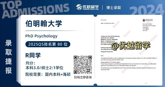 R學(xué)長(zhǎng)是優(yōu)越以前簽約的碩士學(xué)生,在2024申請(qǐng)季如愿拿下伯明翰大學(xué)的心理學(xué)博士PhD博士留學(xué)申請(qǐng)offer!今天就跟優(yōu)越君一起,看看R學(xué)長(zhǎng)是如何圓夢(mèng)的吧。