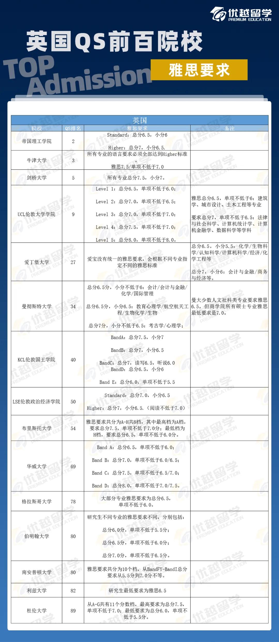 英國(guó)前百院校雅思盤點(diǎn),優(yōu)越君之前已經(jīng)寫(xiě)過(guò),可移步查看,也可直接看下面的匯總圖??