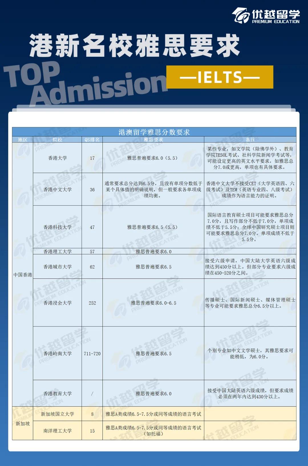 優(yōu)越君匯總了英國(guó)QS前百名校、中國(guó)香港八大院校及新加坡的新國(guó)立和南洋理工大學(xué)的雅思要求,一起來(lái)看看吧!