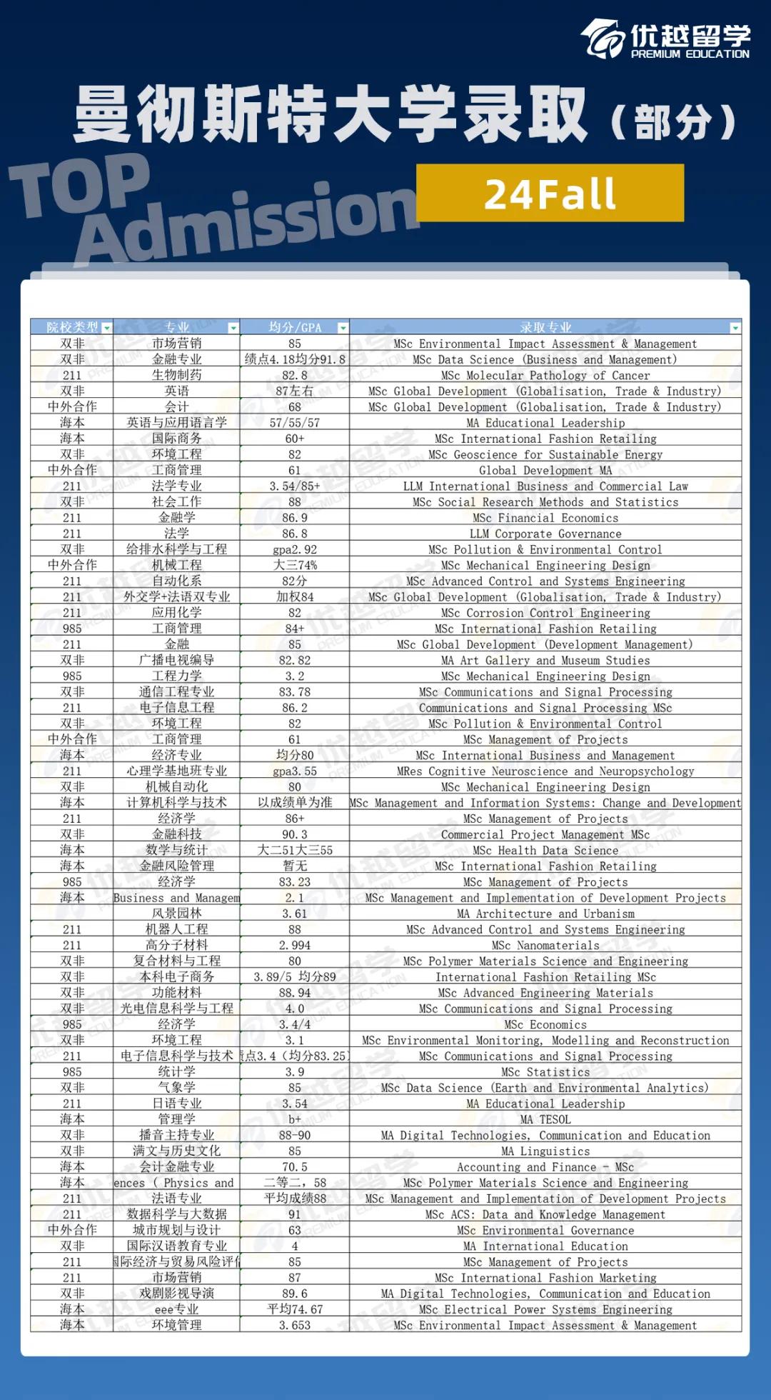 以上是【【英國留學(xué)】曼大25Fall更新要求!院校list、均分要求有哪些調(diào)整? 】相關(guān)的全部內(nèi)容,查看更多【 英國研究生留學(xué)】相關(guān)資訊可前往【優(yōu)越留學(xué)】首頁!詳細(xì)申請規(guī)劃及方案定制請預(yù)約優(yōu)越留學(xué)顧問為你一對一解答!