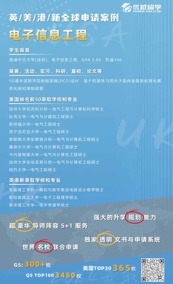 以上是【本期offer榜單:【碩士案例】港中深EE專業(yè),全球申拿下斯坦福、IC、NUS等12枚offer! 】相關(guān)的全部內(nèi)容,查看更多【offer榜單】、【名校案例】相關(guān)資訊可前往【優(yōu)越留學】首頁!世界名校申請,找優(yōu)越留學!選校定校、申請規(guī)劃、文書寫作、背景提升、方案定制一套搞定!點擊【在線咨詢】,優(yōu)越留學顧問24h在線為您一對一解答!