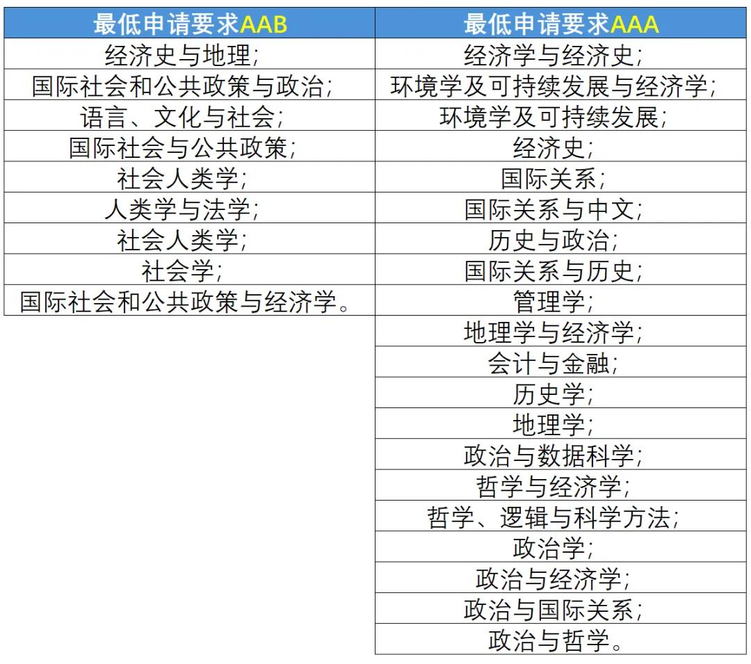 社會歷史學院:人類學、考古學、藝術史等均AAB或ABB即可申請,等等。