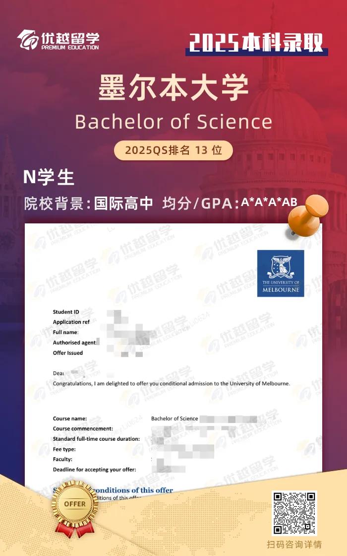 N同學在父母的規(guī)劃下一早準備本科出國留學,通過優(yōu)越團隊精密的規(guī)劃,在25Fall申請季里,如愿拿下墨爾本大學科學專業(yè)的offer。今天就跟優(yōu)越君一起,看看N同學是如何圓夢的吧!