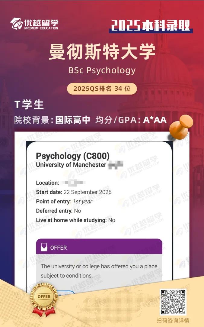 在雙方共同努力下,T同學現(xiàn)已成功拿到曼徹斯特大學和杜倫大學心理學本科offer!我們也相信,其他offer還在路上!我們也預(yù)祝T同學25Fall一切順利~