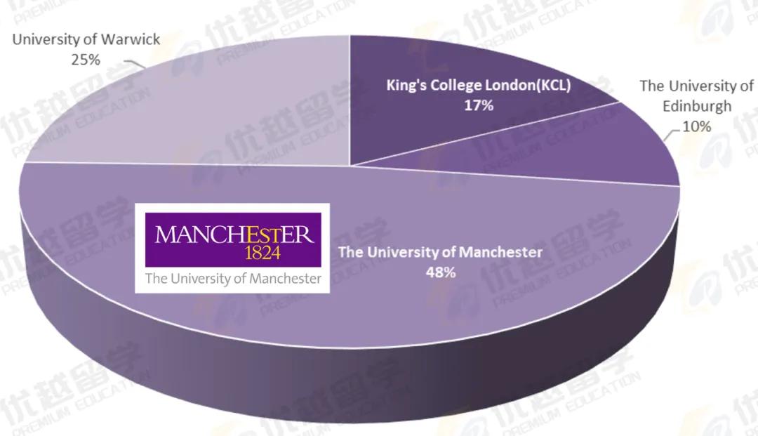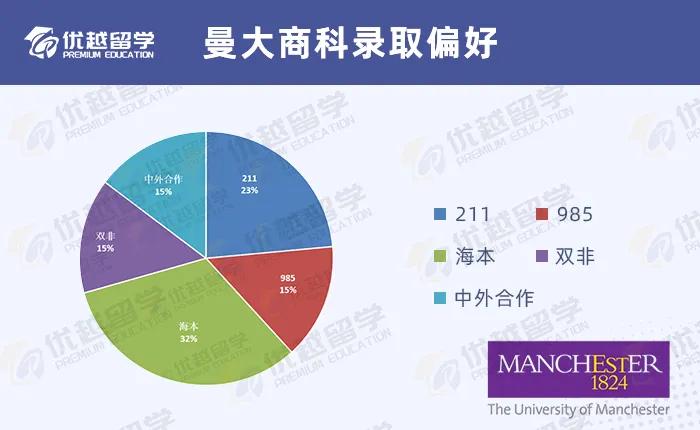 從本科學(xué)校來看,曼大對海本的偏好還是比較明顯的,不過,除海本外,211同學(xué)是主力軍,幾乎占所有錄取的一半。雙非和985院校占比都差不多,不過被錄取的雙非同學(xué),均分一般來說都要比985院校高3-5分。