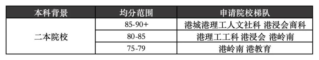 對(duì)于畢業(yè)于二本院校的學(xué)生來(lái)說,如果在這個(gè)成績(jī)范圍內(nèi)也說明有比較強(qiáng)的學(xué)術(shù)能力,可以考慮沖刺港城、港理工的冷門專業(yè),以及港浸會(huì)的傳媒、商科、計(jì)算機(jī)等強(qiáng)勢(shì)專業(yè)。
