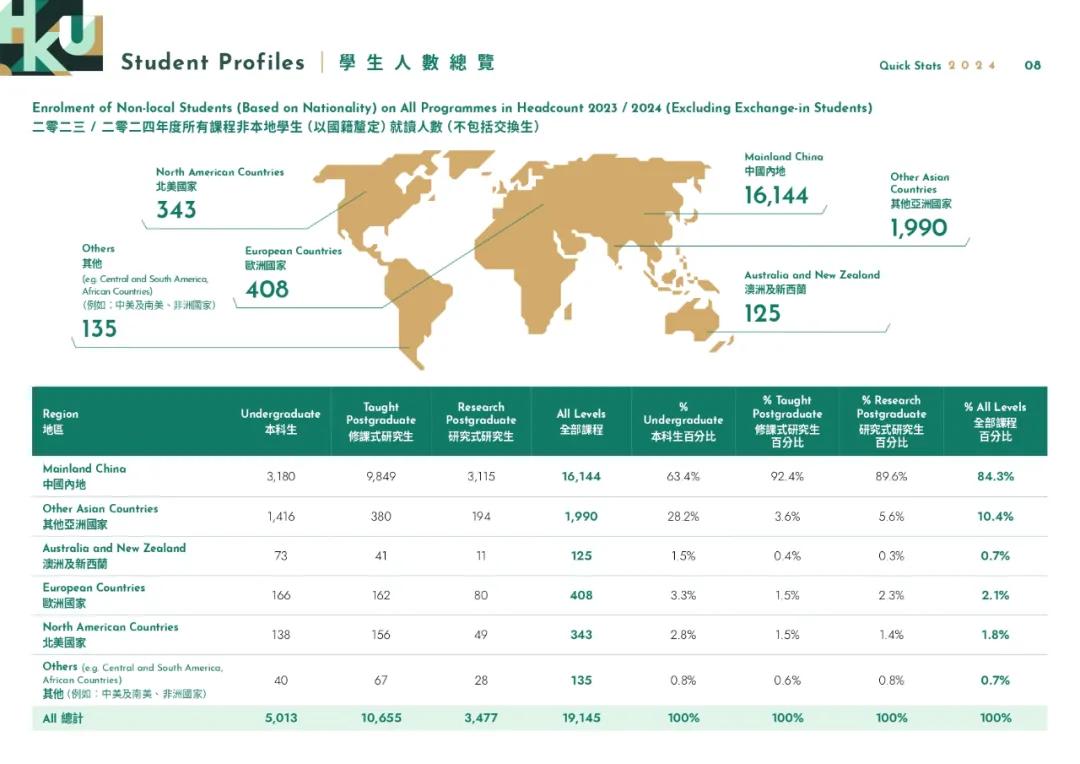 · 生源分布:港大的非本地生主要來自中國(guó)內(nèi)地、其他亞洲國(guó)家、澳新、歐洲、北美及南美非洲等地。其中,內(nèi)地學(xué)生占比最大,非本地生中占比達(dá)到了84.3%。在本科階段,內(nèi)地學(xué)生總數(shù)為3,180人,非本地生中占比63.4%,高于上一年(2022/23為59.6%)。