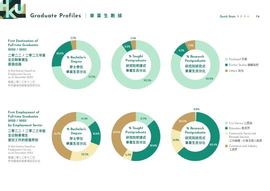 · 就業(yè)情況:2022/23非香港本地畢業(yè)生遍布全球各地。港大所有全日制畢業(yè)生中,73.7%選擇直接就業(yè),22.6%選擇繼續(xù)攻讀研究生,另有3.7%有其他不同的選擇。