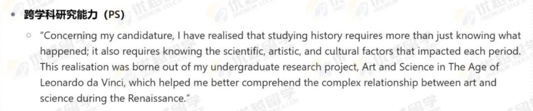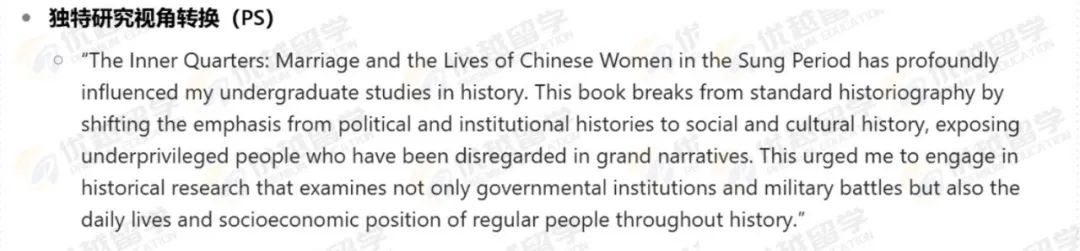 在Z同學(xué)的PS 中最突出的是其獨(dú)特的研究視角轉(zhuǎn)換與跨學(xué)科研究能力,以及基于此構(gòu)建的清晰且長(zhǎng)遠(yuǎn)的學(xué)術(shù)規(guī)劃,充分展現(xiàn)出學(xué)術(shù)潛力與對(duì)歷史學(xué)專業(yè)的深度熱愛(ài)。