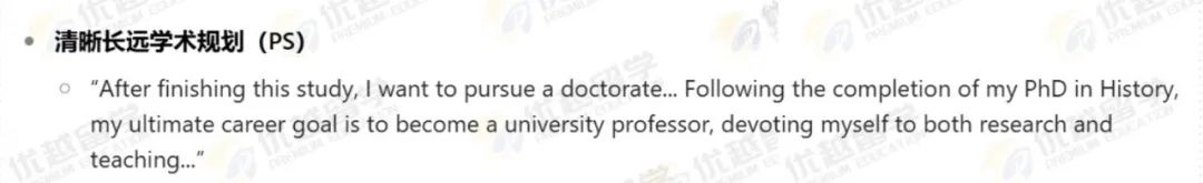 此外,在文書(shū)中我們明確規(guī)劃了從碩士到博士再到教授的學(xué)術(shù)路徑,體現(xiàn)對(duì)歷史學(xué)研究的長(zhǎng)期執(zhí)著追求和在學(xué)術(shù)領(lǐng)域深入發(fā)展的決心,讓招生官看到其學(xué)術(shù)穩(wěn)定性與潛力。