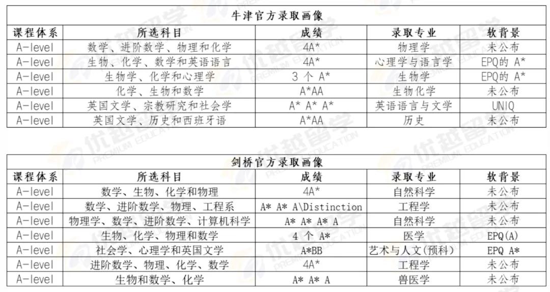 但我們統(tǒng)計了牛劍官方發(fā)布的錄取畫像,我們發(fā)現(xiàn),錄取者基本都是有兩門或三門科目達到A*。甚至有些是4*,還會附加EPQ等項目來輔助申請。