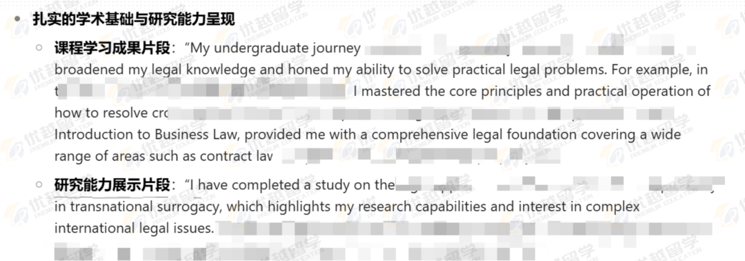 詳細(xì)闡述本科課程學(xué)習(xí)成果,表明獲得了扎實(shí)的專業(yè)知識(shí),具備解決實(shí)際法律問題的能力,滿足 LSE 對(duì)申請(qǐng)者學(xué)術(shù)基礎(chǔ)的要求。而對(duì)一些爭(zhēng)議話題法律適用的研究,展示了深入研究復(fù)雜國際法律問題的能力和興趣,這與 LSE 鼓勵(lì)學(xué)生進(jìn)行學(xué)術(shù)探索、追求深度研究的理念相契合,體現(xiàn)出申請(qǐng)者有潛力在 LSE 的學(xué)術(shù)環(huán)境中取得優(yōu)異成績(jī)。