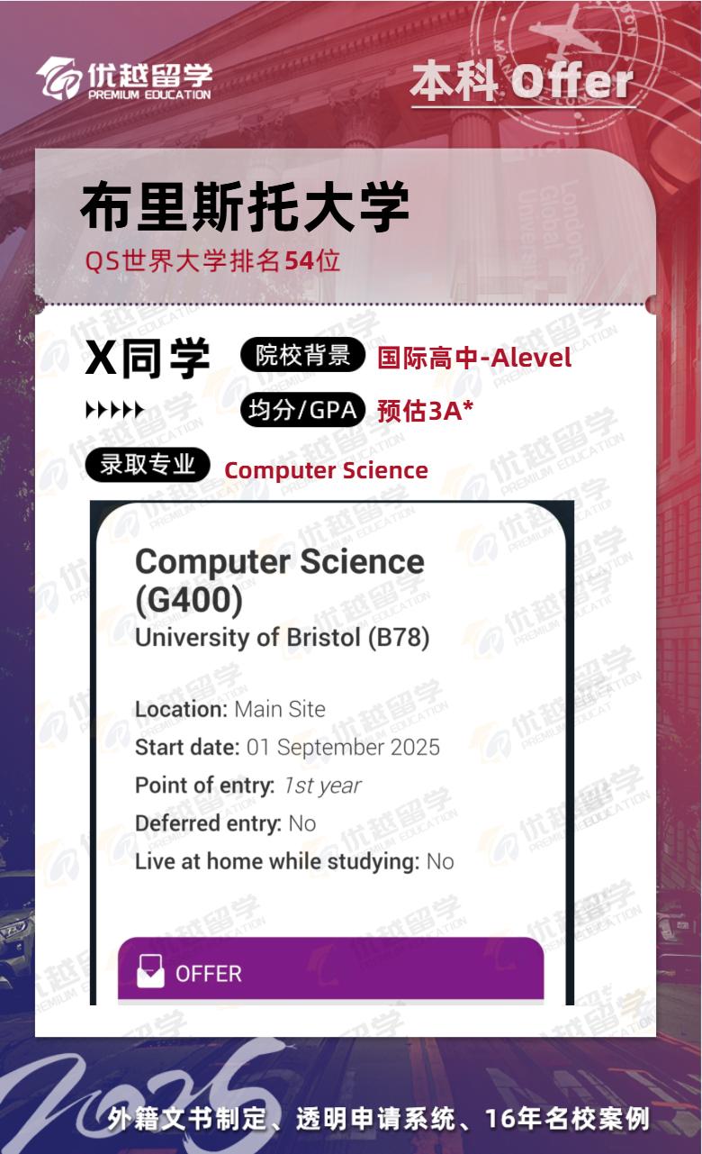 以上是【【本科案例】A-Level預(yù)估3A*,拿下布里斯托大學(xué)王牌計(jì)算機(jī)專業(yè)! 】相關(guān)的全部內(nèi)容,查看更多【 本科留學(xué)申請】相關(guān)資訊可前往【優(yōu)越留學(xué)】首頁!詳細(xì)申請規(guī)劃及方案定制請預(yù)約優(yōu)越留學(xué)顧問為你一對一解答!