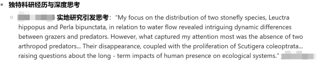 我們?cè)谖臅性敿?xì)描述了L同學(xué)的通過實(shí)地研究引發(fā)的深度思考,從現(xiàn)象深入思考人類活動(dòng)對(duì)生態(tài)系統(tǒng)的影響,這種深度思考體現(xiàn)出遠(yuǎn)超本科成績的科研素養(yǎng)和對(duì)專業(yè)問題的洞察力,讓招生官看到其科研潛力。體現(xiàn)出主動(dòng)探索和深入研究的精神,這在申請(qǐng)者中較為突出,彌補(bǔ)了本科成績的不足。