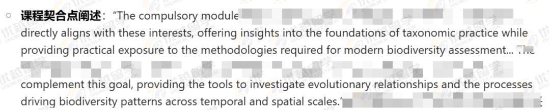 緊接著,我們?cè)谖臅姓宫F(xiàn)對(duì) IC 帝國理工該專業(yè)課程有深入了解,能精準(zhǔn)指出課程與自身研究興趣和目標(biāo)的契合之處。表明L同學(xué)在分類學(xué)實(shí)踐基礎(chǔ)、物種進(jìn)化關(guān)系研究、生態(tài)數(shù)據(jù)科學(xué)分析等方面的需求與專業(yè)課程設(shè)置的高度匹配,讓招生官相信其入學(xué)后能充分利用課程資源,在專業(yè)上有所建樹。