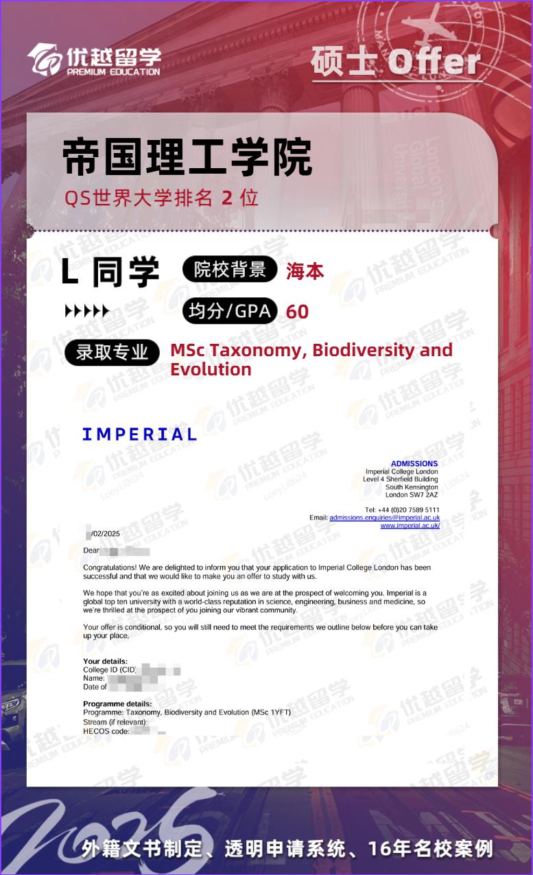 ? 錄取院校及專業(yè):帝國理工學(xué)院-MSc Taxonomy, Biodiversity and Evolution
