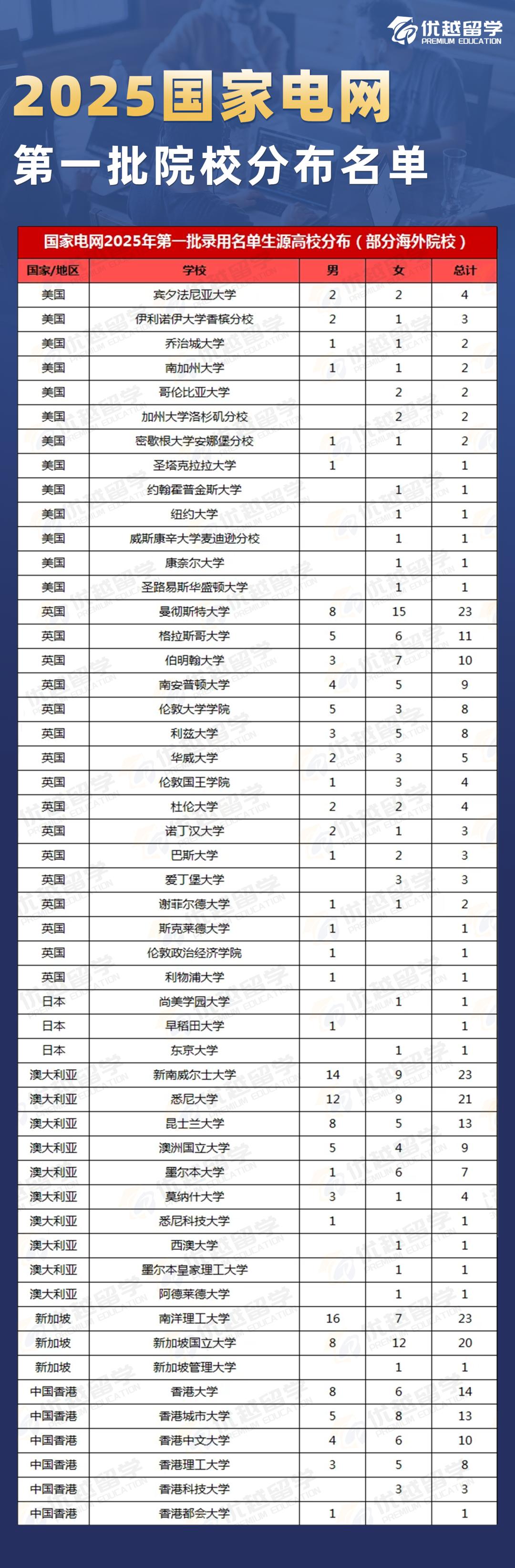 以上是【 優(yōu)越留學(xué):2025國家電網(wǎng)公布錄用名單,英美港新澳扎堆錄取! 】相關(guān)的全部內(nèi)容,查看更多【國外留學(xué)申請】相關(guān)資訊可前往【優(yōu)越留學(xué)】首頁!詳細(xì)申請規(guī)劃及方案定制請預(yù)約優(yōu)越留學(xué)顧問為你一對一解答!