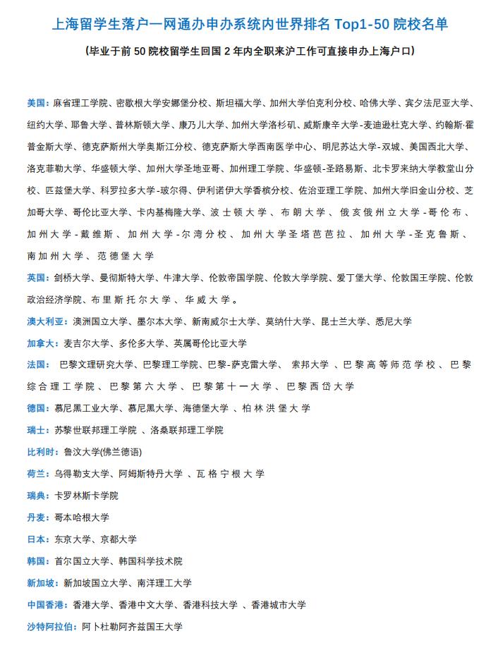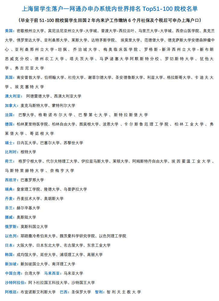 由于這些排名每年都會(huì)更新,最近,上海市人社局在留學(xué)生落戶系統(tǒng)內(nèi),更新了落戶激勵(lì)條件中的全球前100高校名單,除了保留去年公布的大學(xué)名單之外,由159所院校增加為191所。