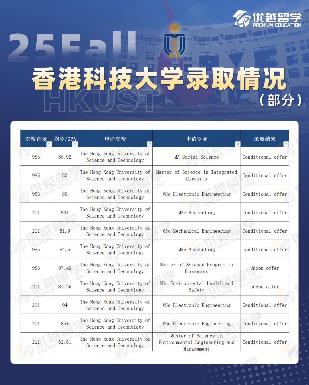 在錄取難度方面,港科技和港大、港中文有明顯不同,它更傾向于錄取 985、211 院校和海外本科背景的學(xué)生,雙非院校學(xué)生的錄取比例比較低。