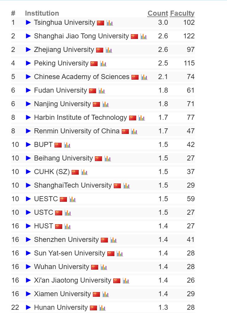 第6名由佐治亞理工學院、韓國科學技術院及加拿大多倫多大學共同占據(jù),而第9名則匯聚了清華大學、東北大學、西北大學、加州大學伯克利分校與猶他大學五所高校。