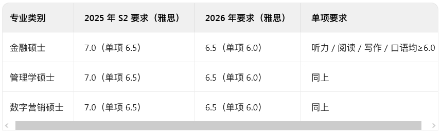 數(shù)字營銷、金融、管理學(xué)等專業(yè) 2025 年秋季入學(xué)仍按原標(biāo)準(zhǔn)執(zhí)行,建議申請者優(yōu)先沖刺語言成績或考慮配讀語言班。