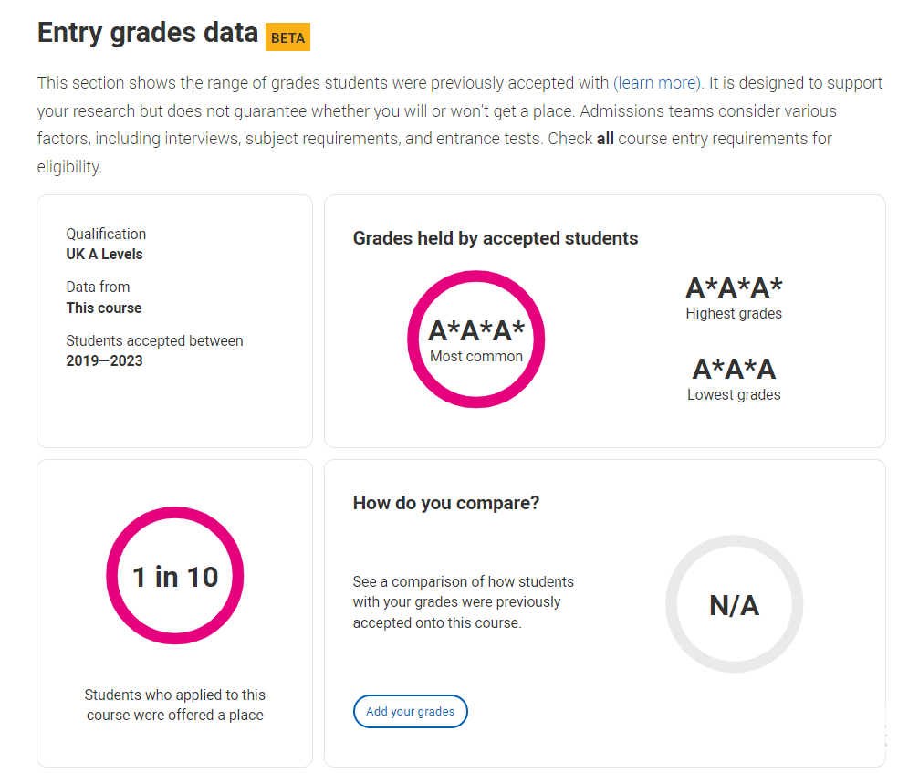 而UCAS上線的這個(gè)search tool,只需要輸入目標(biāo)專業(yè)名稱,就可以給你呈現(xiàn)2022-2024 年被錄取學(xué)生的 A-level 成績(jī),包括最高分、最低分以及錄取比例!也就是說,我們可以借助這個(gè)工具,直接看清英國(guó)大學(xué)官網(wǎng)申請(qǐng)要求與真實(shí)門檻之間的“鴻溝”。
